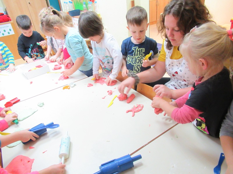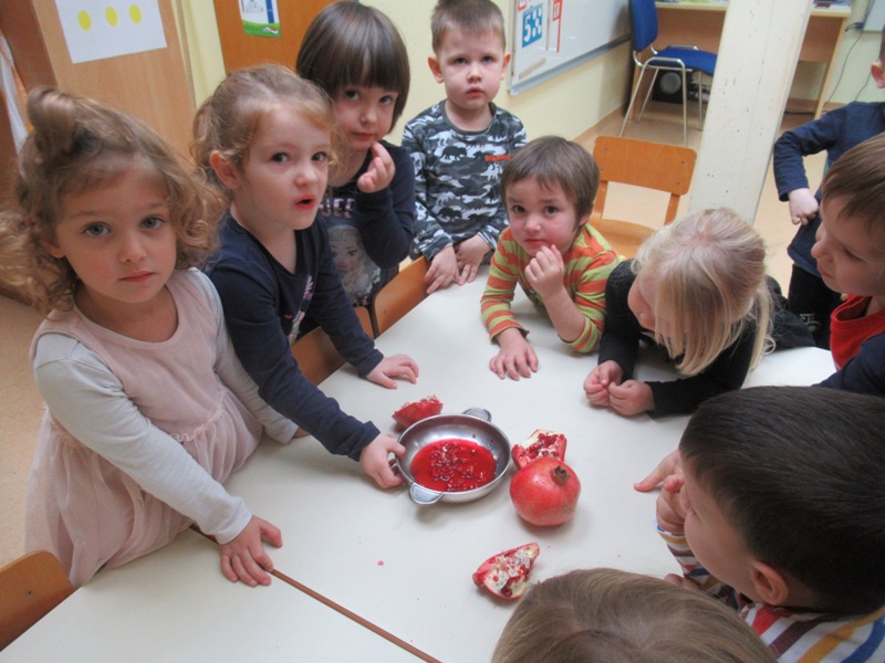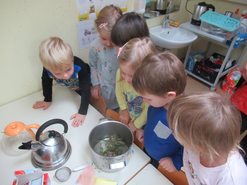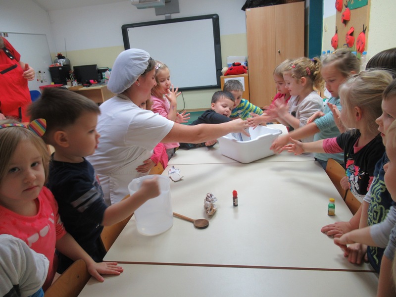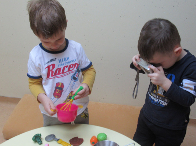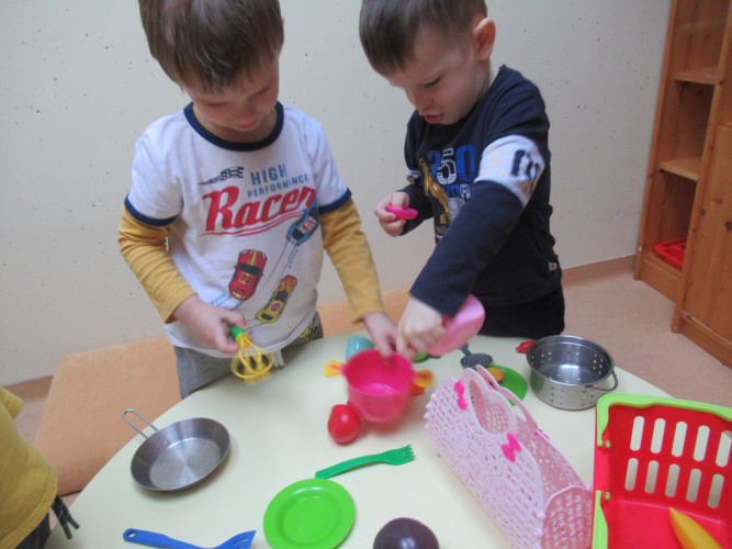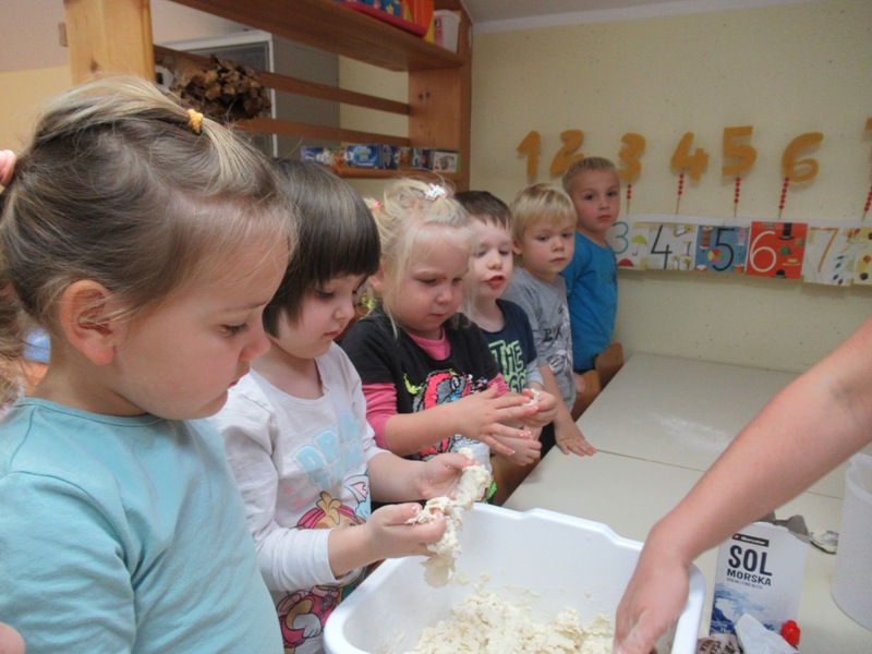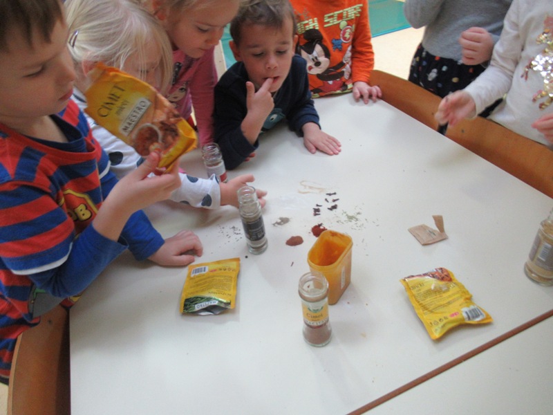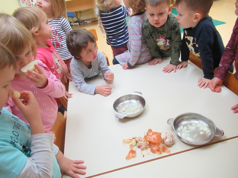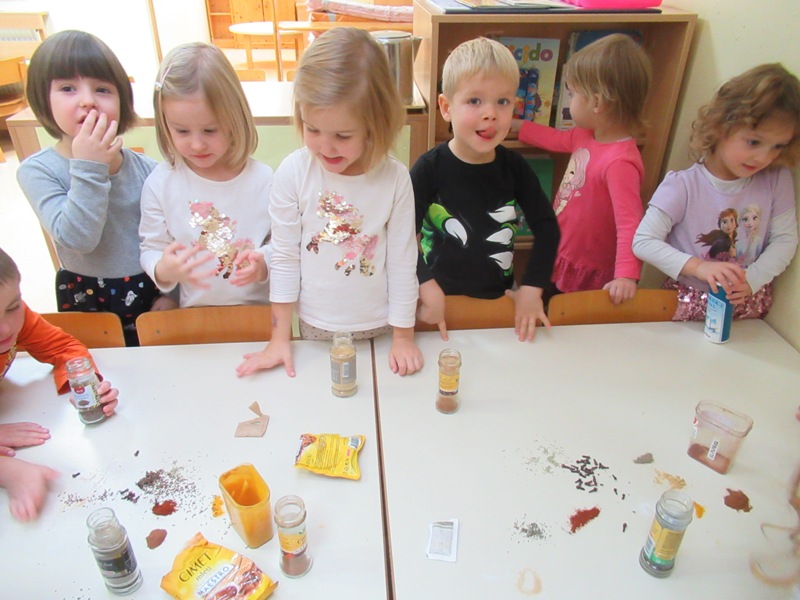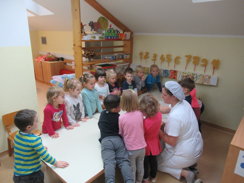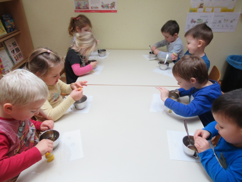 V mesecu oktobru in novembru so otroci doživljali posamezno čutilo v funkciji prehranjevanja (kaj diši, kakšnega okusa je, barve...), seznanjali so se z različnimi zaporedji pri pripravi določene vrste hrane, spoznali kuhinjske pripomočke, recepte in začimbe. V vrtcu smo pripravili jabolčni sok, okušali repo in zelje, skuhali domači čaj, jedli granatno jabolko, povabili mamico kuharico, da nam je pripravila igralno testo ter se veliko igrali v igralnem kotičku Kuhinja. Pri projektu Kuhajmo skupaj pa so nam bili v pomoč tudi starši otrok. Skupaj z otrokom so doma pripravljali jedi. Svoja kuharska doživetja so otroci z nasmehom in ponosom v vrtcu opisovali. Tako so si otroci pridobivali izkušnje, krepili so se medsebojni odnosi in prav vsi smo ugotovili, da je priprava jedi in kuhanje lahko zanimivo in zabavno.