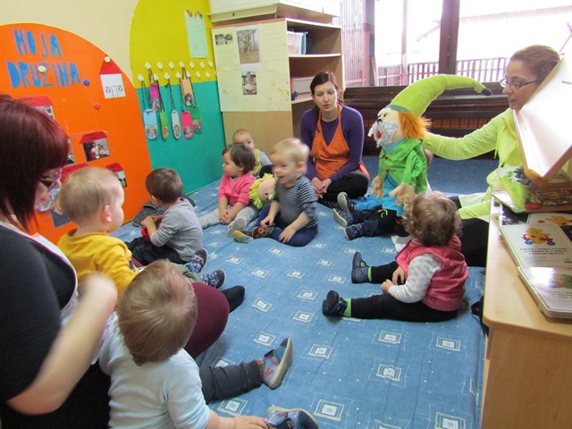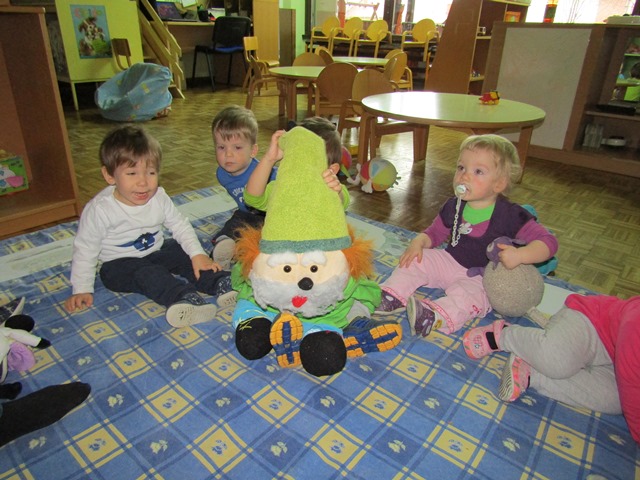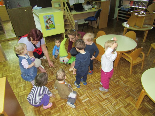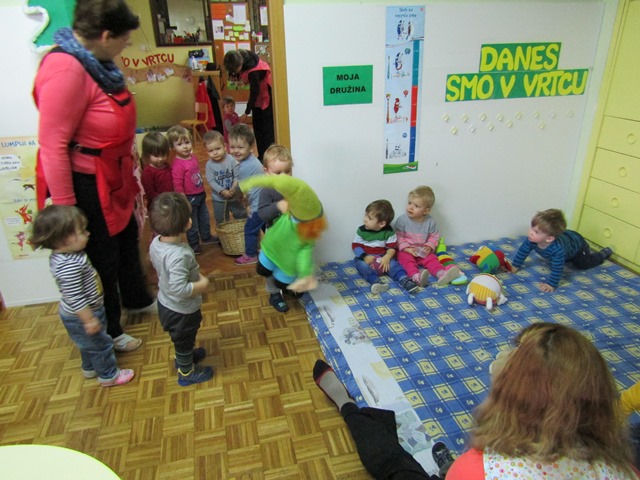 Otroci iz skupine »Račke« so nam prinesli Zelenega škrata, ki je imel za nas nalogo- Spoznavajte, primerjajte in poimenujte različno sadje.